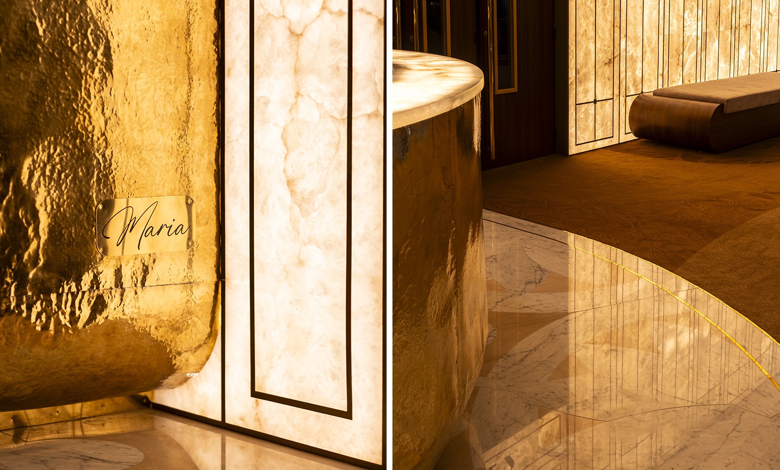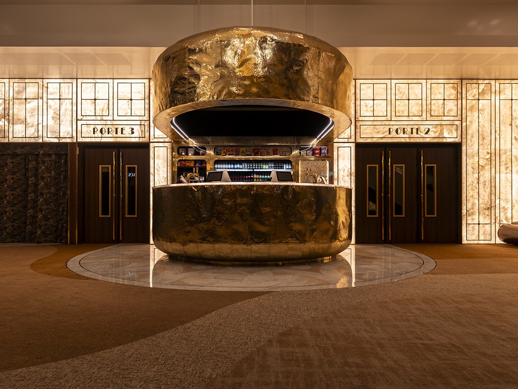 Here, materials speak to each other: the hammered brass of the semicircular bar, its mirrored reflections, the marble rosette inspired by the 1932 original, and the backlit alabaster wall. Together, they compose a sensory and spatial experience. This is no longer a simple lobby: it is a staging of textures and light that invites visitors to slow down, to observe, to feel.