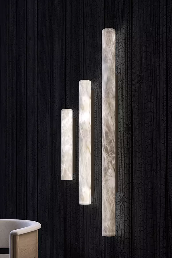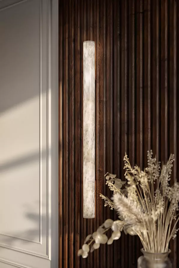 The SUMATRA sconce floats delicately, its alabaster cylinder appearing to detach from the wall thanks to a nearly invisible reflective chrome support. Its subtle glow and refined silhouette lend it an elegant and captivating presence. Available in three heights (19.7 in, 31.5 in, and 47.2 in) and also with a 4.7 diameter wall sconce or in vertical and horizontal pendant versions, it offers a variety of luminous compositions based on the alabaster cylinder theme.